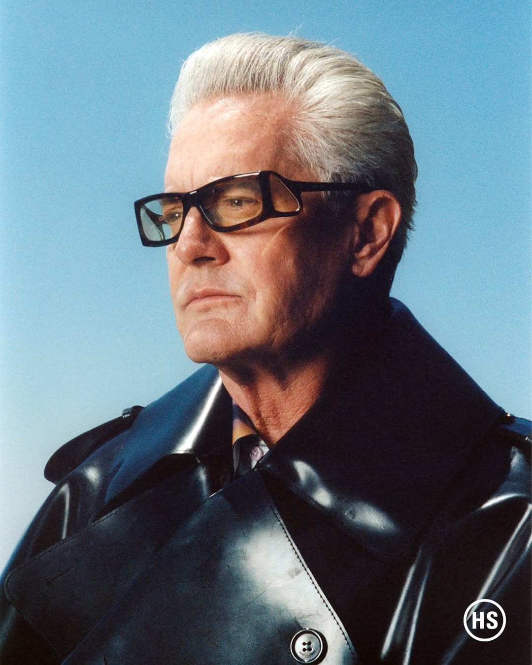 Photo. Jun 2025. Agent Cooper reincarnates in high gloss—vinyl trench, silver hair, and a stare made for mystery. Source Vince Aung & Highsnobiety & Kyle MacLachlan