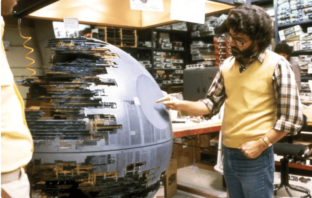 Film. May 21, 1980. Death Star WIP. George pointing like “make it bigger.” Practical FX era, peak nerdcore. Source Star Wars: The Empire Strikes Back
