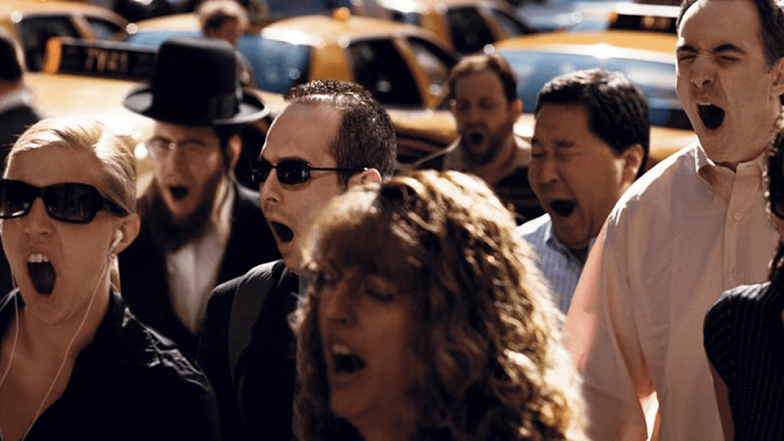 Photo. 2009. 42nd and Vanderbilt. synchronized yawns rupture the commute, a city caught slipping its mask in daylight. Source Peter Funch