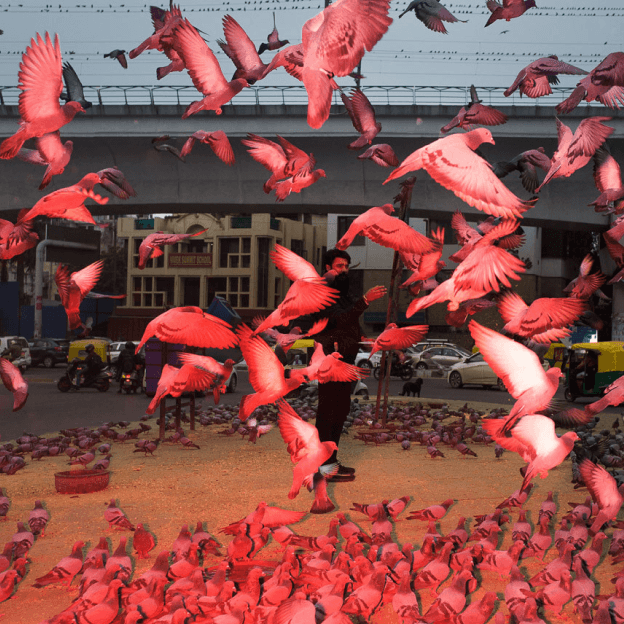 Photo. 2015. . neon birds explode over street routine, reality tinted until the ordinary turns staged and uncanny. Source Benoit Paille