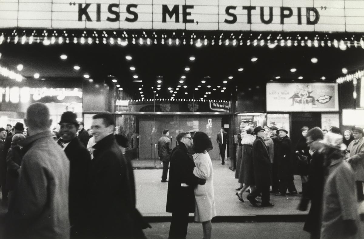 Photo. 1960s. Marquee screams “kiss me, stupid” while a couple obeys—Meyerowitz freezes love mid-sidewalk chaos. Source Joel Meyerowitz / Tate