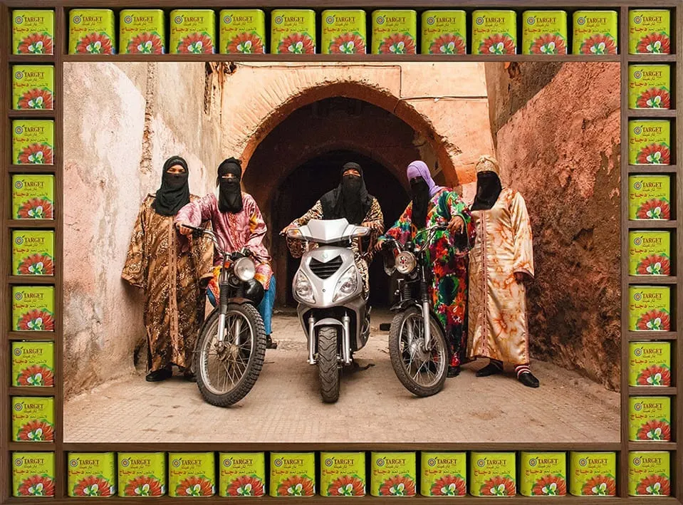 Photo. Nov 13 2023. Kesh Angels. Hijab, horsepower & pop-packaging remix the streets of Marrakech. Source @hassanhajjaj_larache