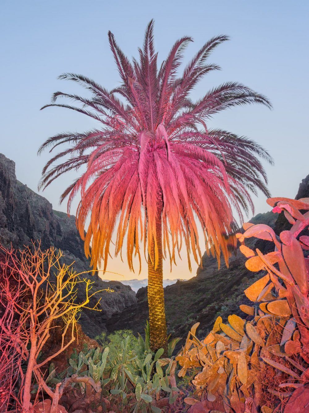 Photo. 2024. A palm set ablaze in synthetic hues—nature stylized into hyperreal utopia. Source Inka & Niclas Lindergård