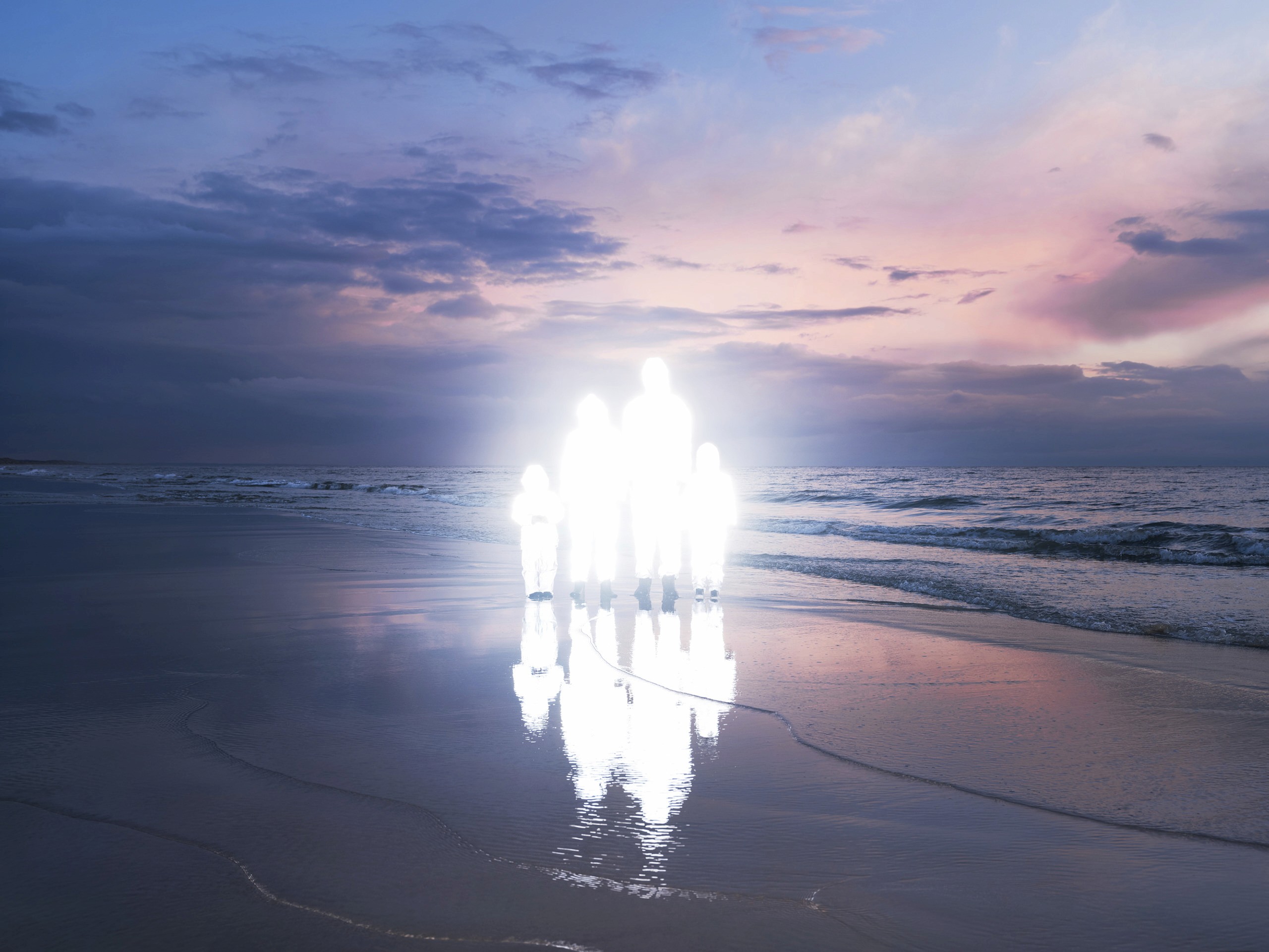 Photo. 2024. Family becomes flare—washed in light, vanishing into myth on a violet-lit shore. Source Inka & Niclas Lindergård